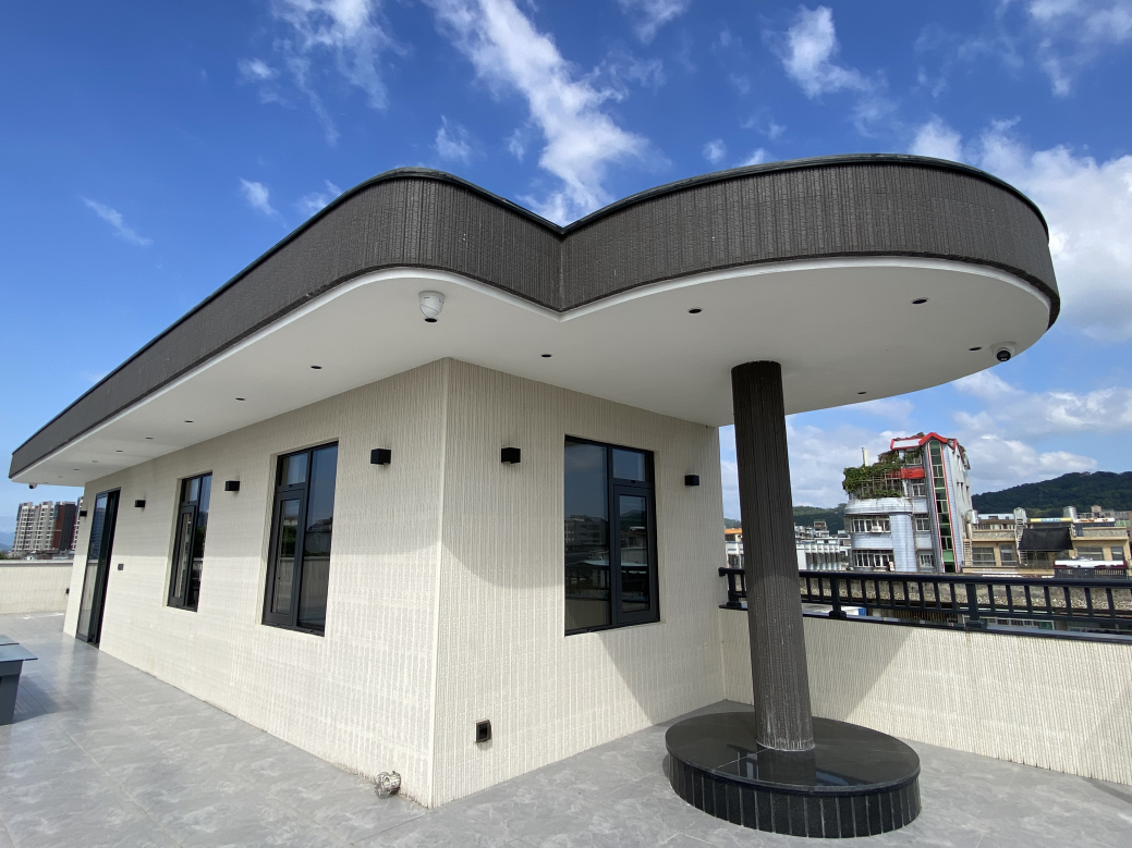 別墅主體采用白色丹霞石大面積鋪貼,在藍天白云的映襯下顯得格外明亮通透、引人注目。屋頂及立柱則以咖色丹霞石進行點綴,使不同色調的丹霞石相互交織,色彩層次豐富而又和諧統一。